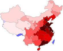 De bevolkingsdichtheid van China is ongeveer 140 personen per vierkante kilometer. Op de afbeelding hiernaast kun je zien dat de bevolkingsverdeling niet evenwichtig is. Zo kun je ook zien dat het Noord-Westen van China nauwlijks bevolkt is.